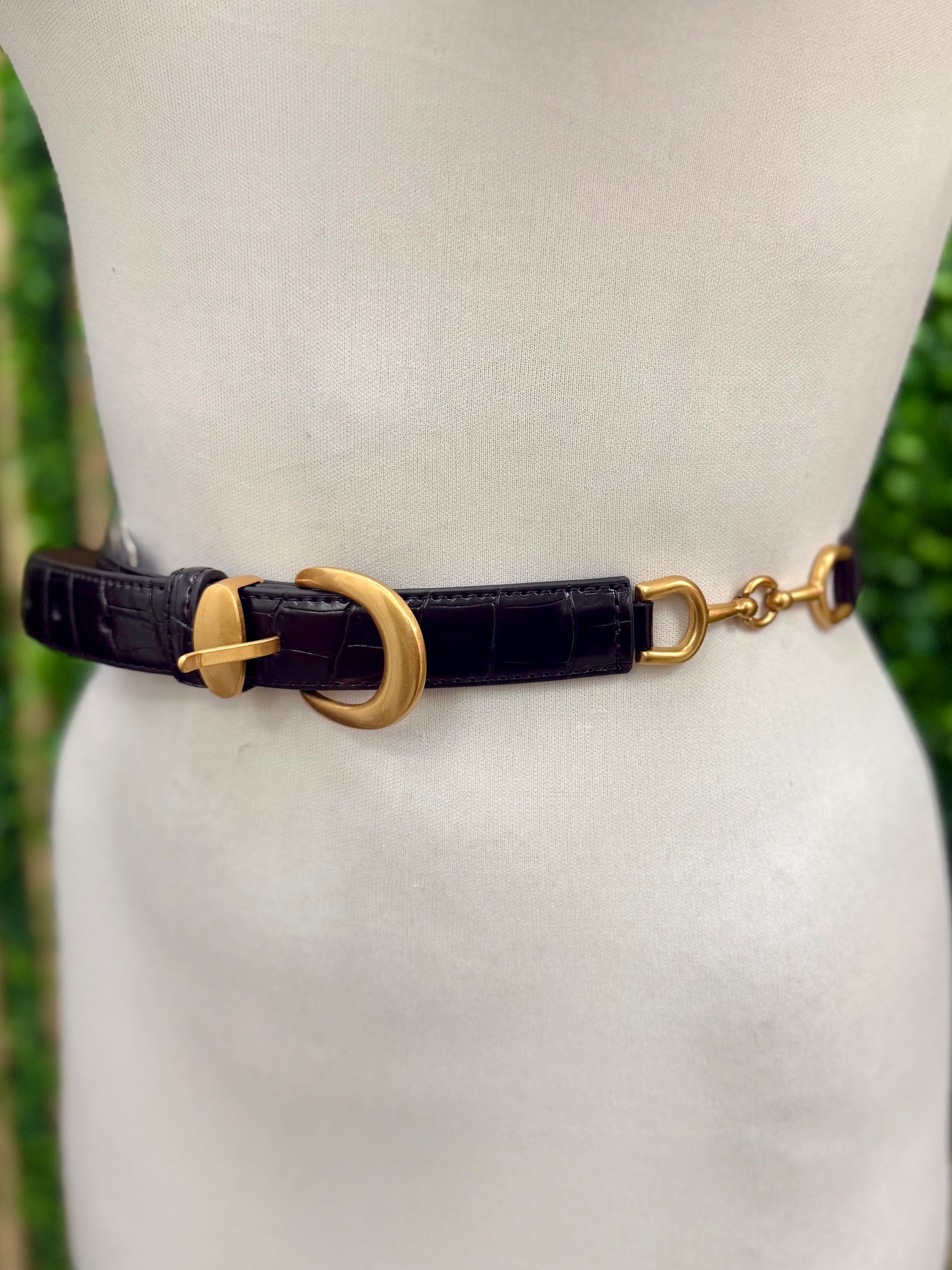 - Elevate your outfit with the Connecting Buckle Croc Thin Belt, designed to add a chic touch of texture and sophistication. Its sleek croc-embossed finish and slim profile make it perfect for accentuating your waist without overpowering your look.