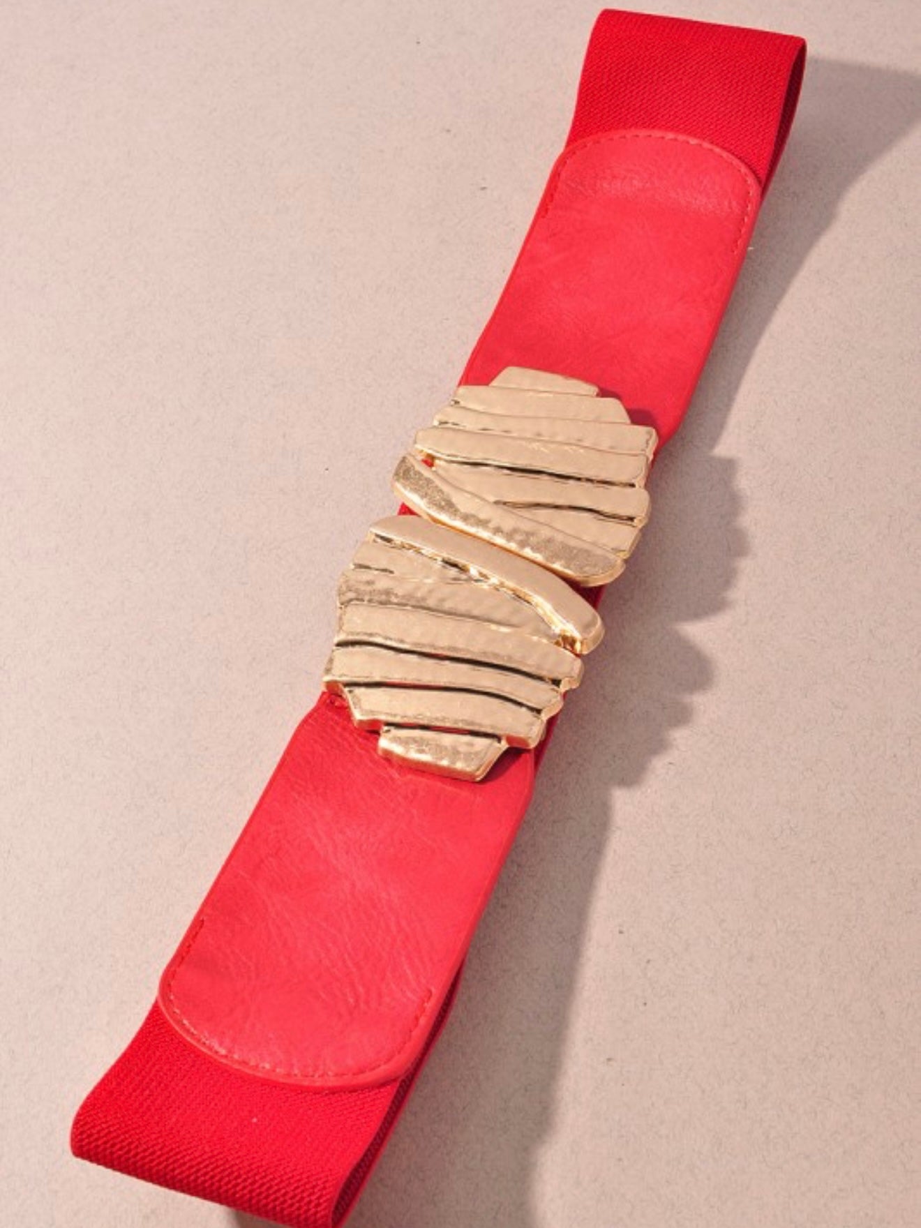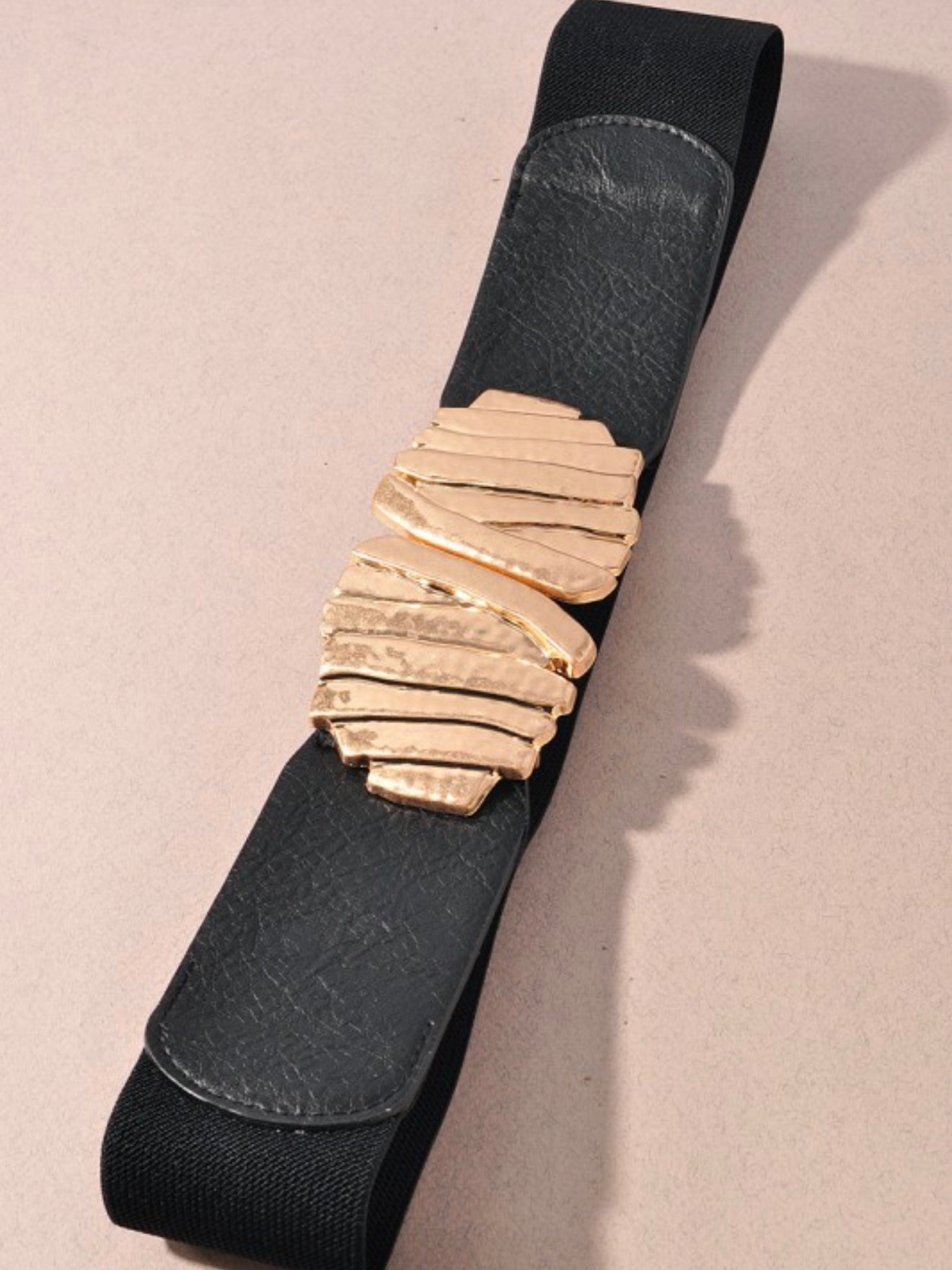 - A chic hammered metal buckle stretch belt featuring a textured, sculptural buckle paired with a comfortable elastic band.