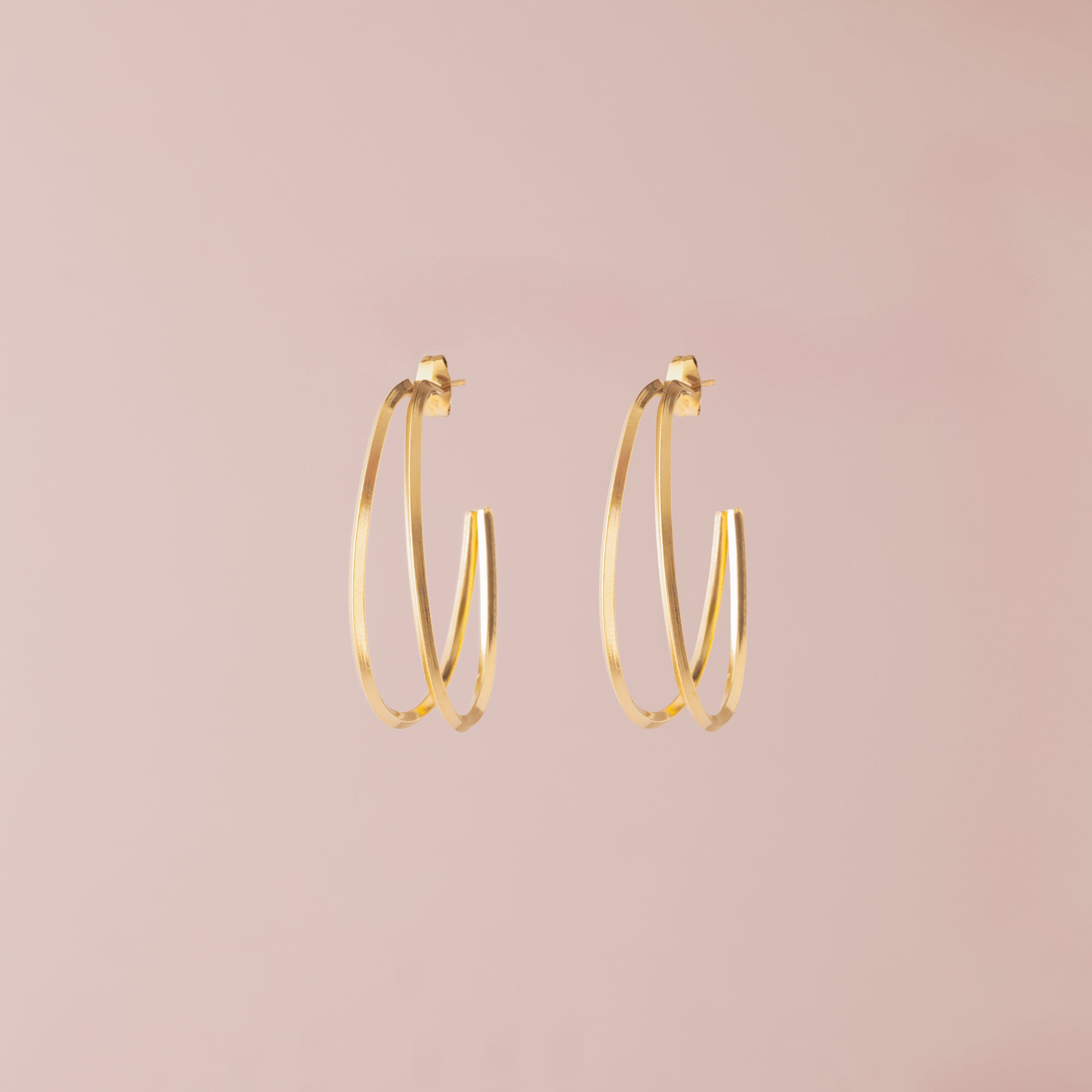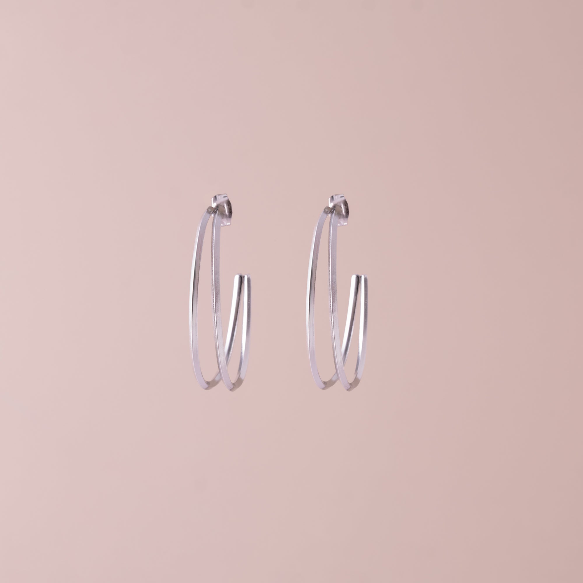 This pair of stainless steel open hoop earrings features a double-banded design where two polished hoops cross at the base. The piece is available in two finishes: a bright silver hue or a brilliant luster evocative of pure gold.