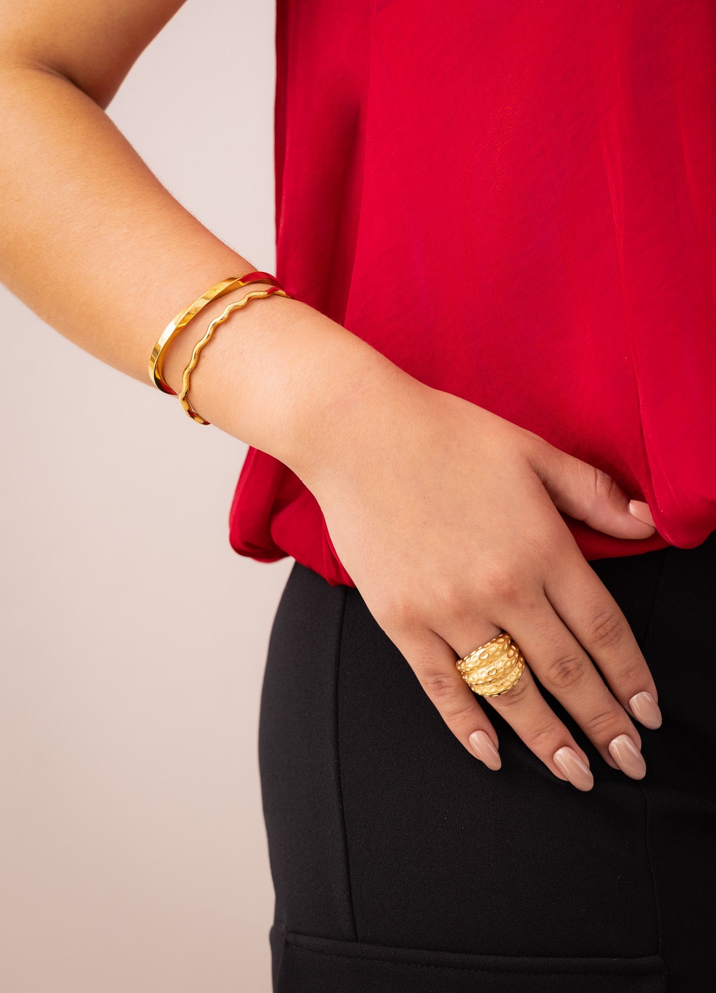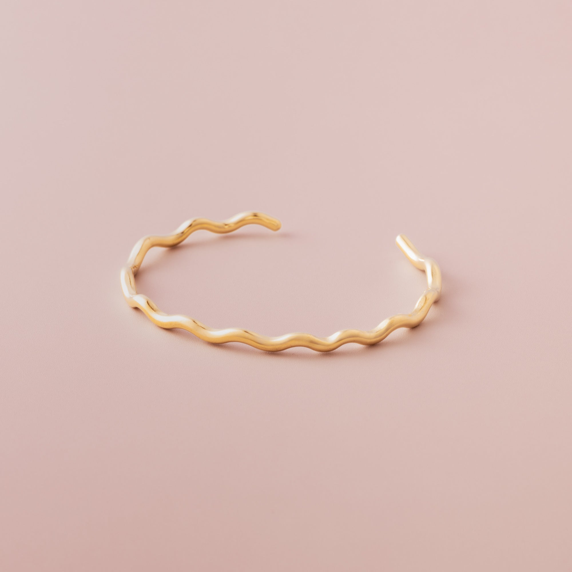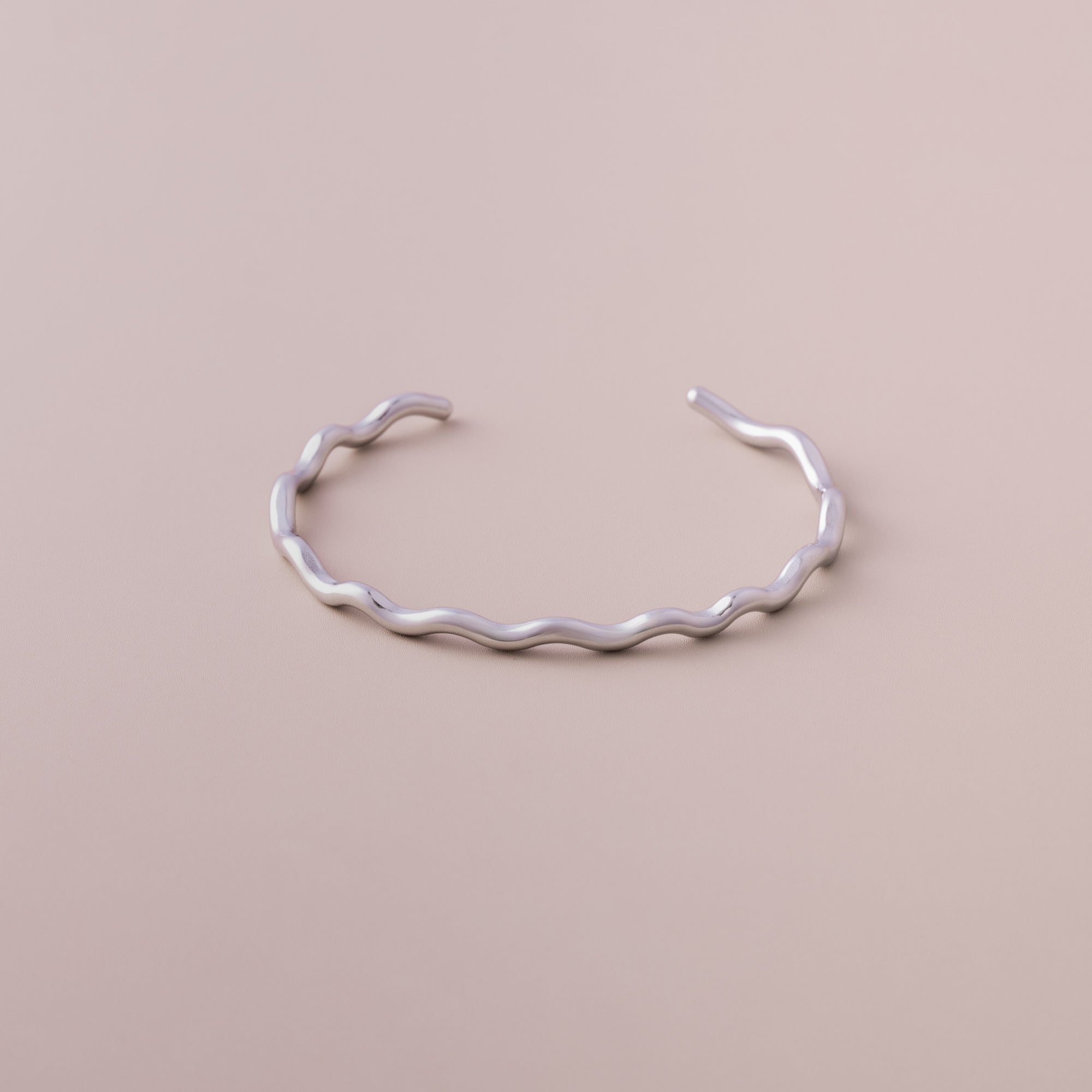 This slender stainless steel open cuff features a continuous, polished surface that is shaped into a distinct, fluid wave pattern. The cuff is presented in two reflective finishes: bright silver-tone and brilliant gold-tone.