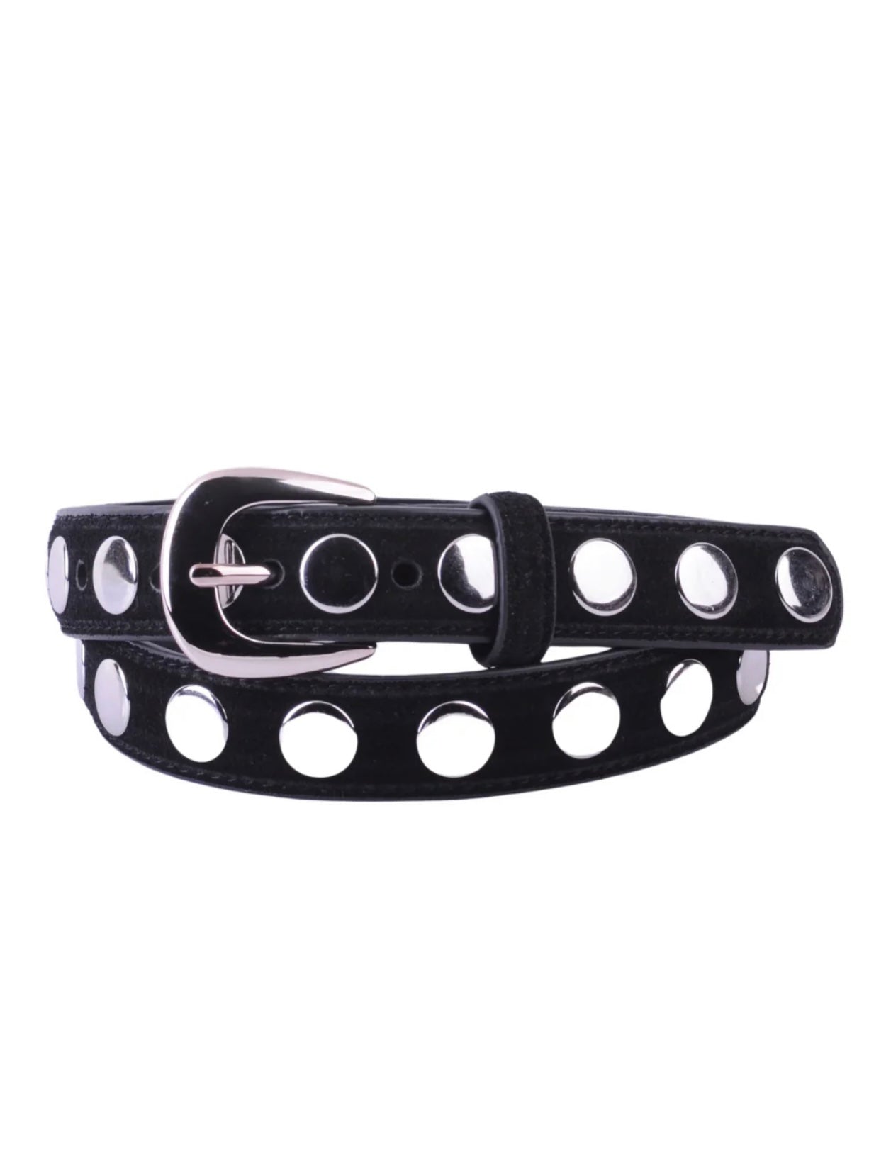 - Elevate your outfit with this Studded Suede Belt, crafted from soft, durable suede and adorned with stylish studs for a bold, edgy touch.