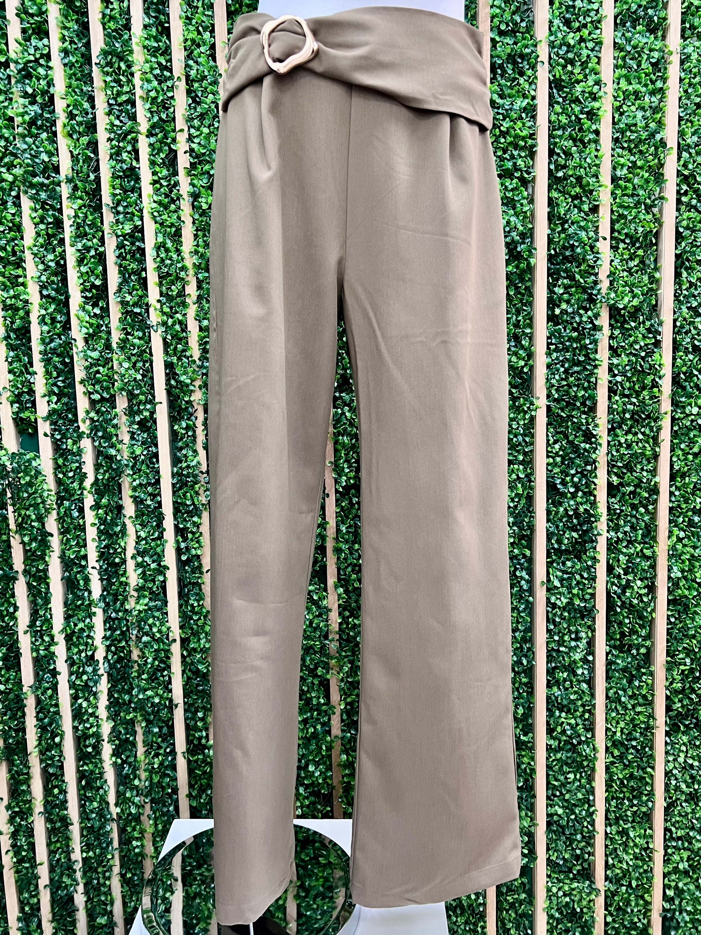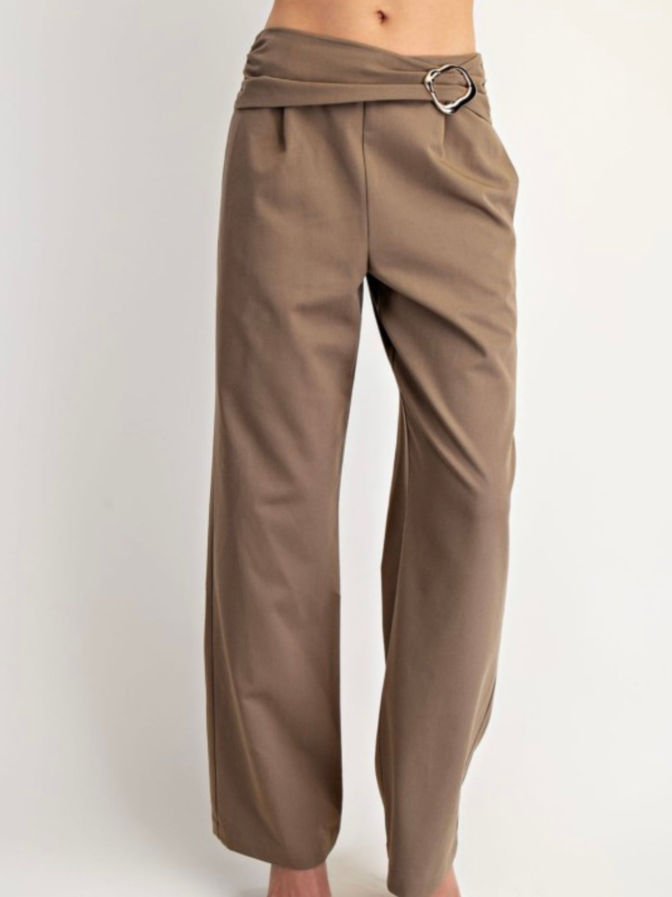 - Elevate your style with the Mocha high-waisted woven pants, featuring a distinctive side-gathered waistband and an eye-catching asymmetrical belt with a metal buckle.