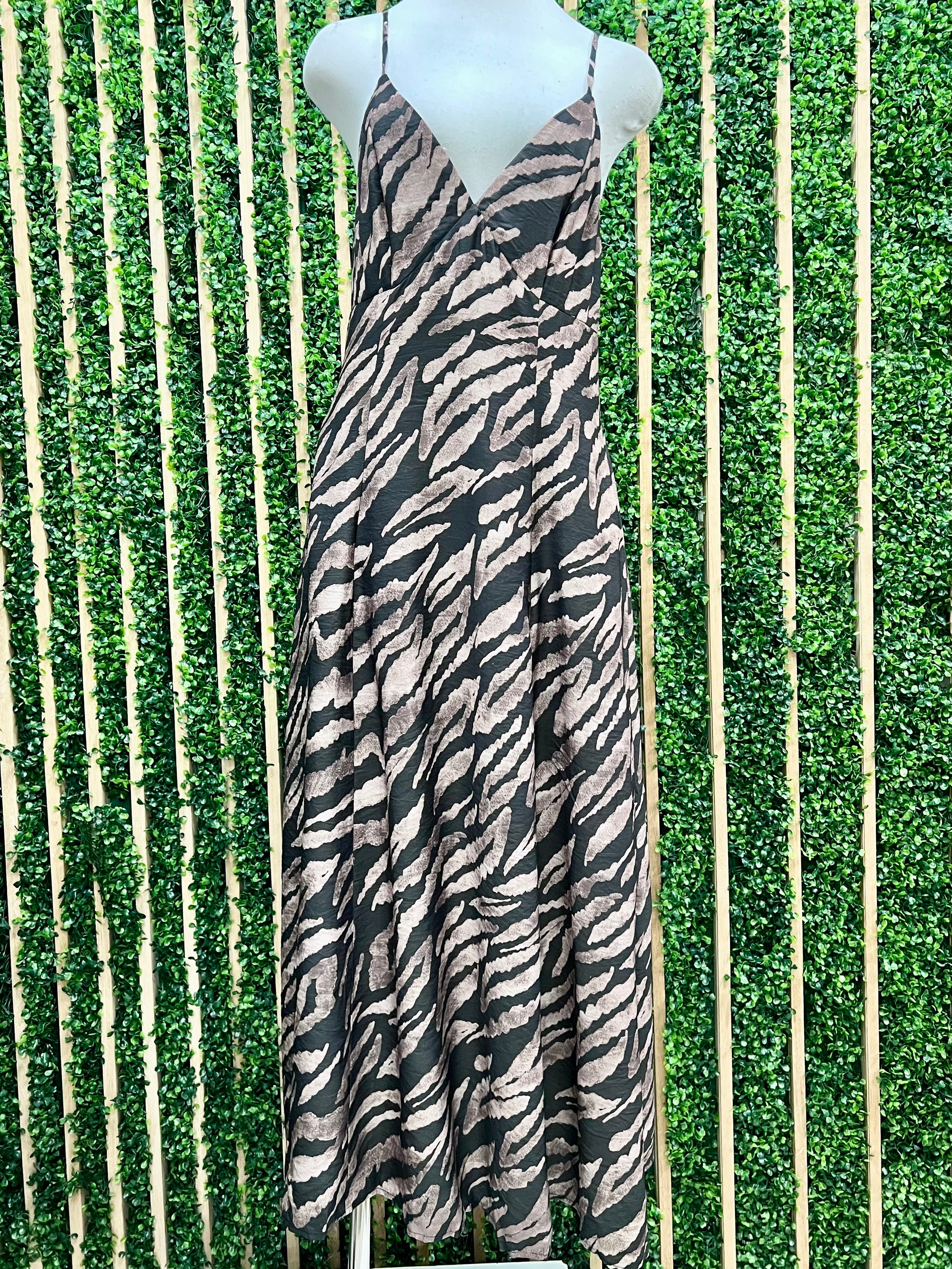 • Featuring a sleek charcoal base enhanced by a fierce animal print, this dress accentuates your silhouette while the open back detail adds an unexpected touch of elegance and daring.