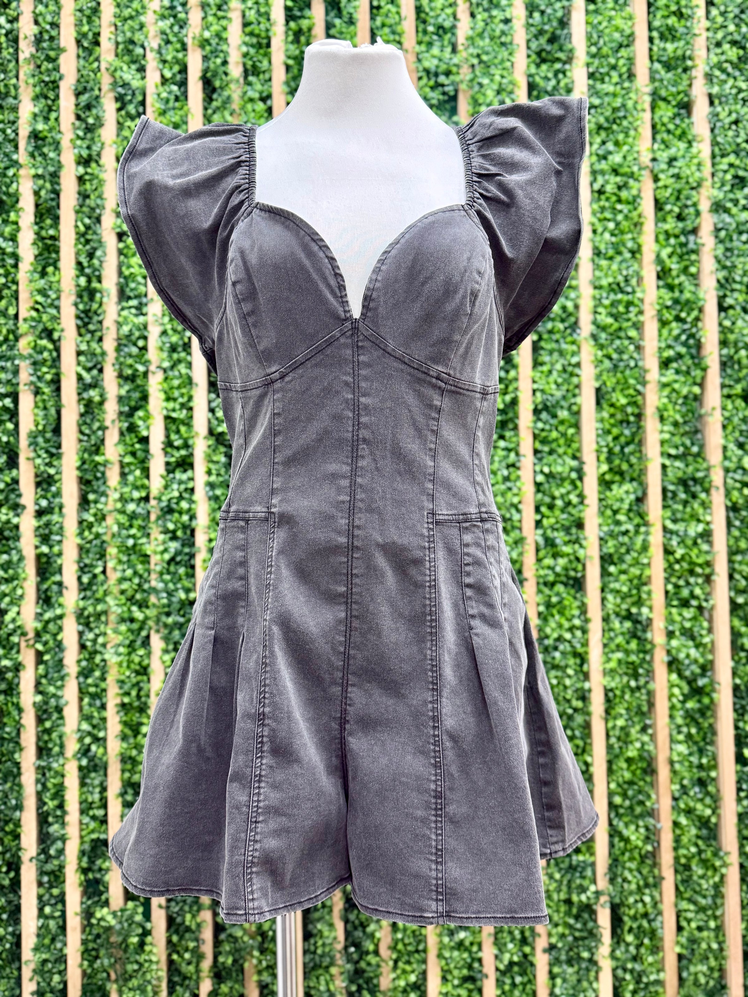 - The washed black color, sweetheart neckline, and ruffled details create a chic and feminine look.