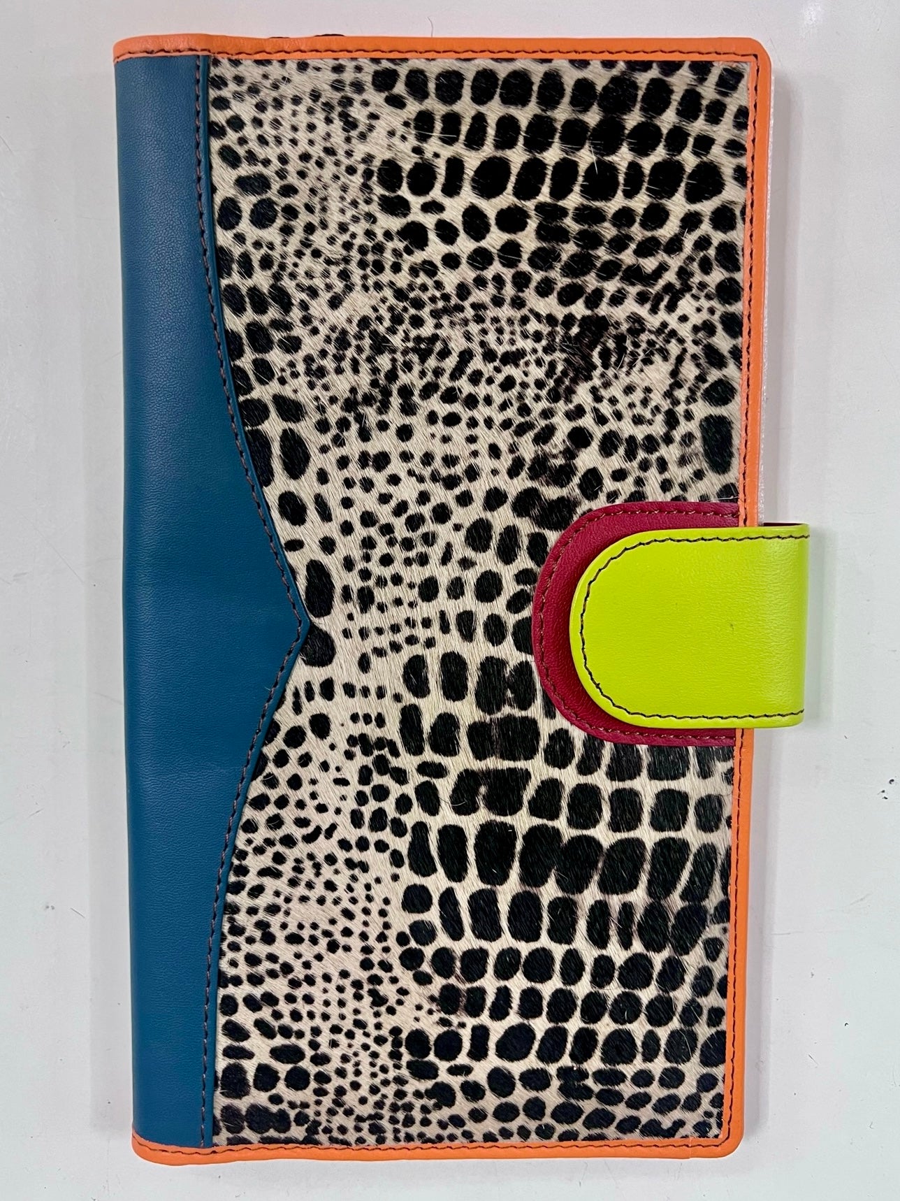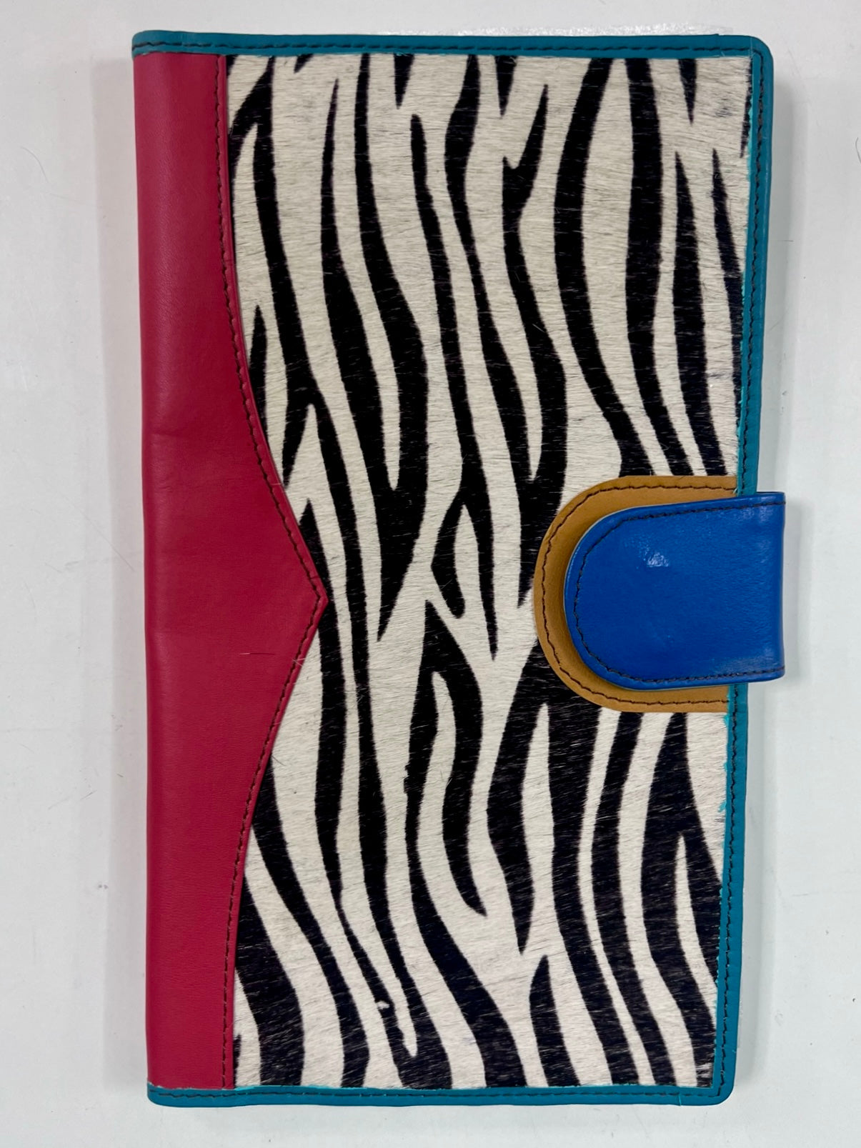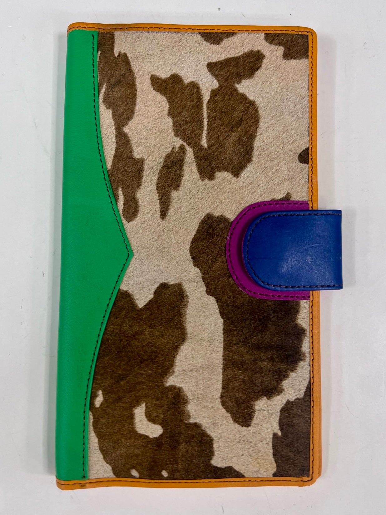 Genuine leather wallet featuring bright colors and hair on hide detailing. Handmade in India.