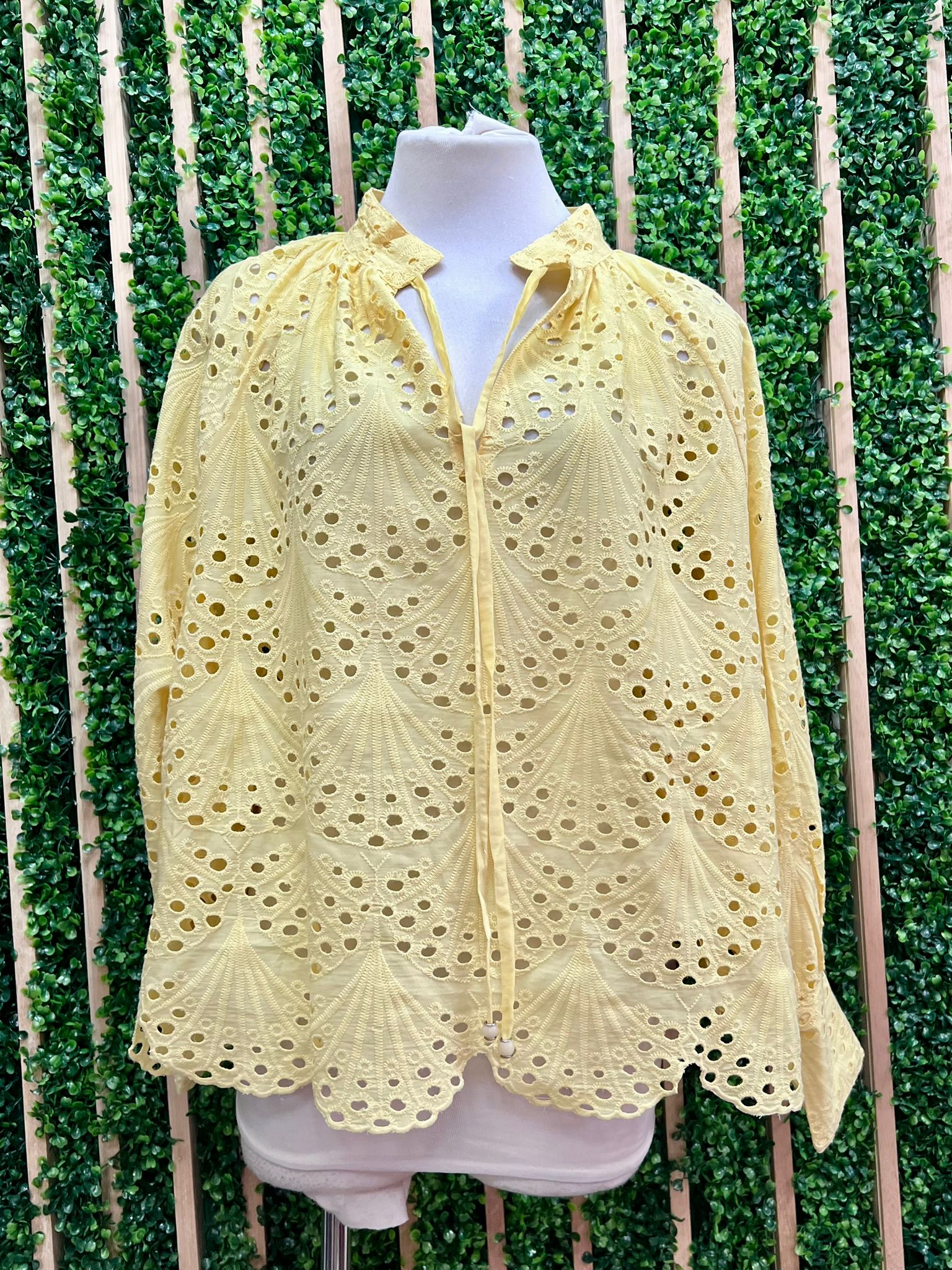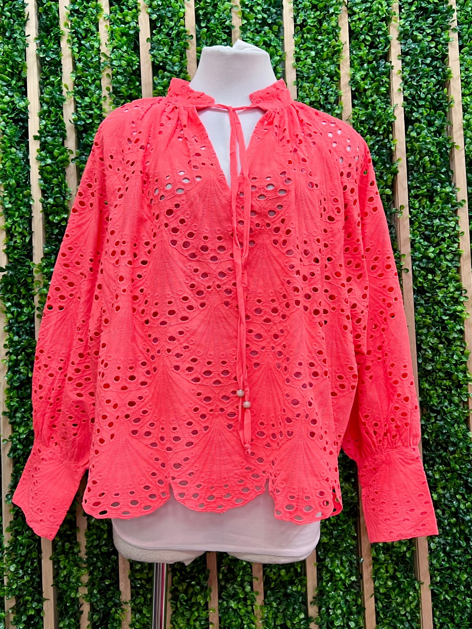 Crafted from intricately embroidered eyelet fabric, this blouse features a relaxed silhouette with delicate cut-out embroidery that adds texture and elegance. The soft neckline with tie detail creates a flattering, slightly bohemian look while the lightweight fabric keeps the piece breathable and comfortable.