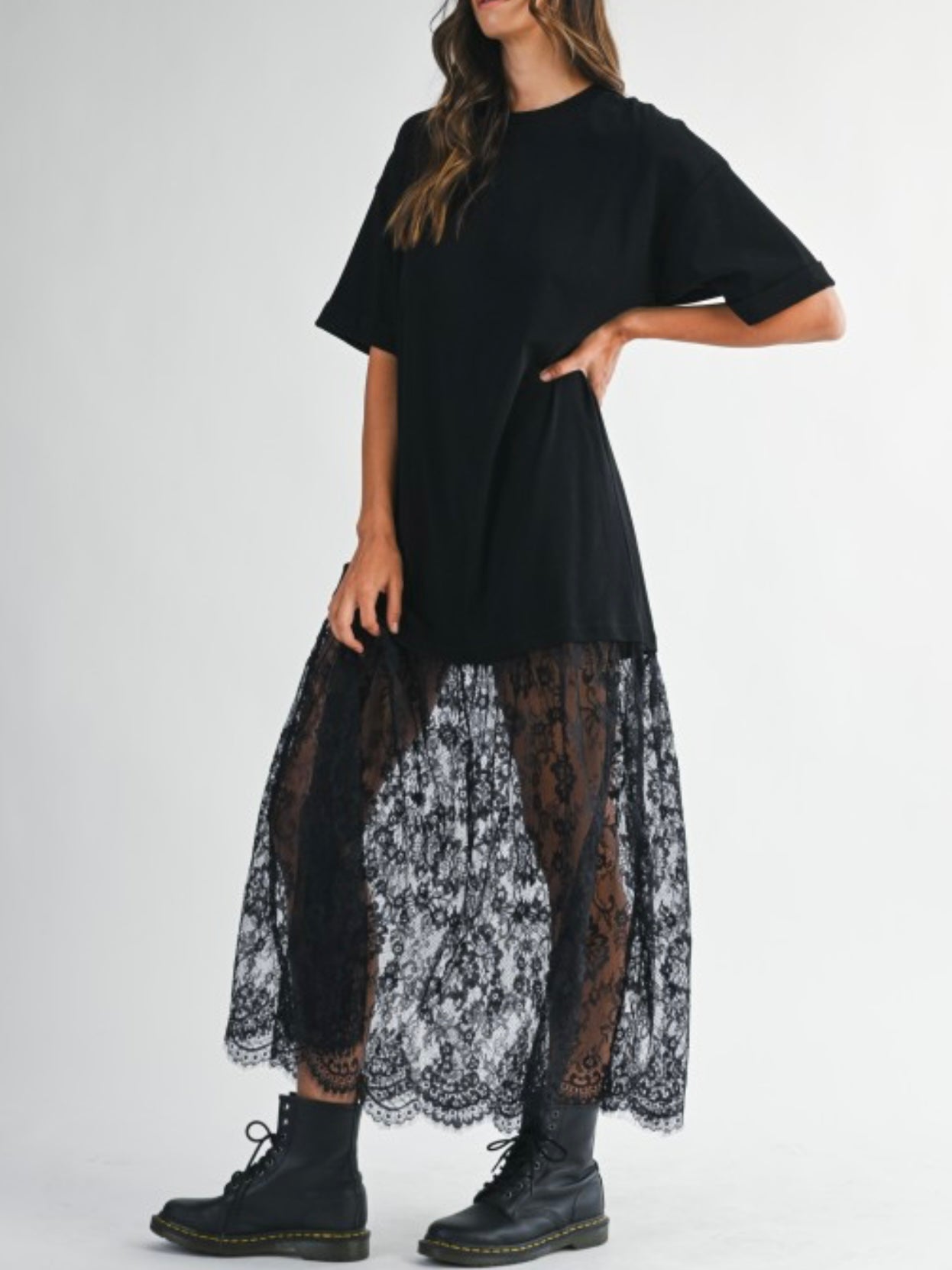 - This versatile dress features a flattering oversize fit, delicate lace details, and a contrast skirt that adds a touch of elegance.
