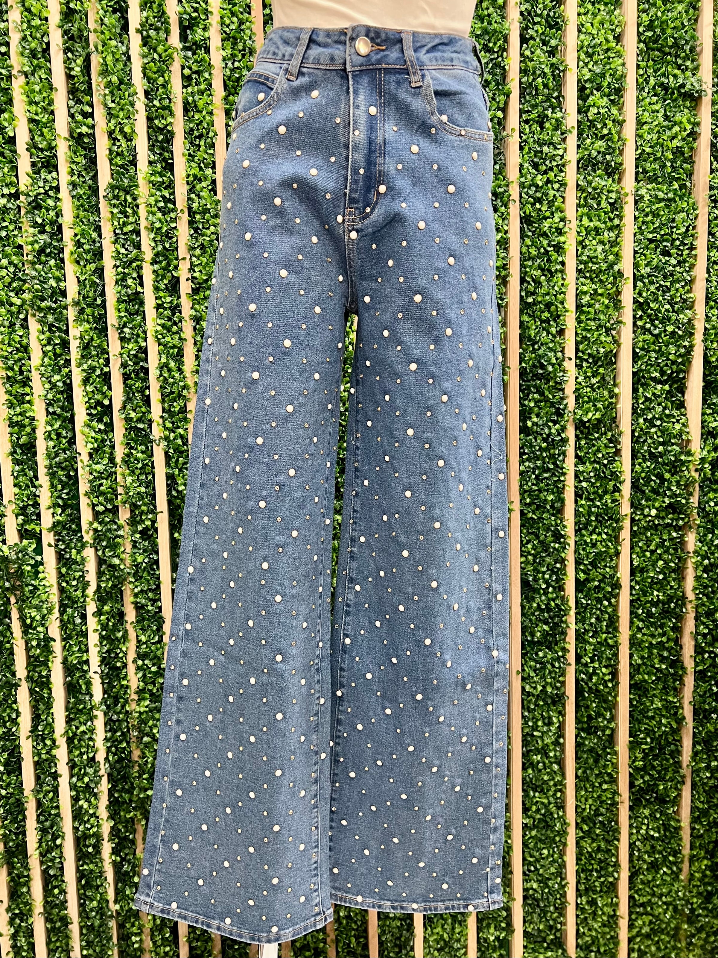 - Elevate your everyday denim game with these stunning wide-leg jeans featuring delicate pearl stud detailing.
