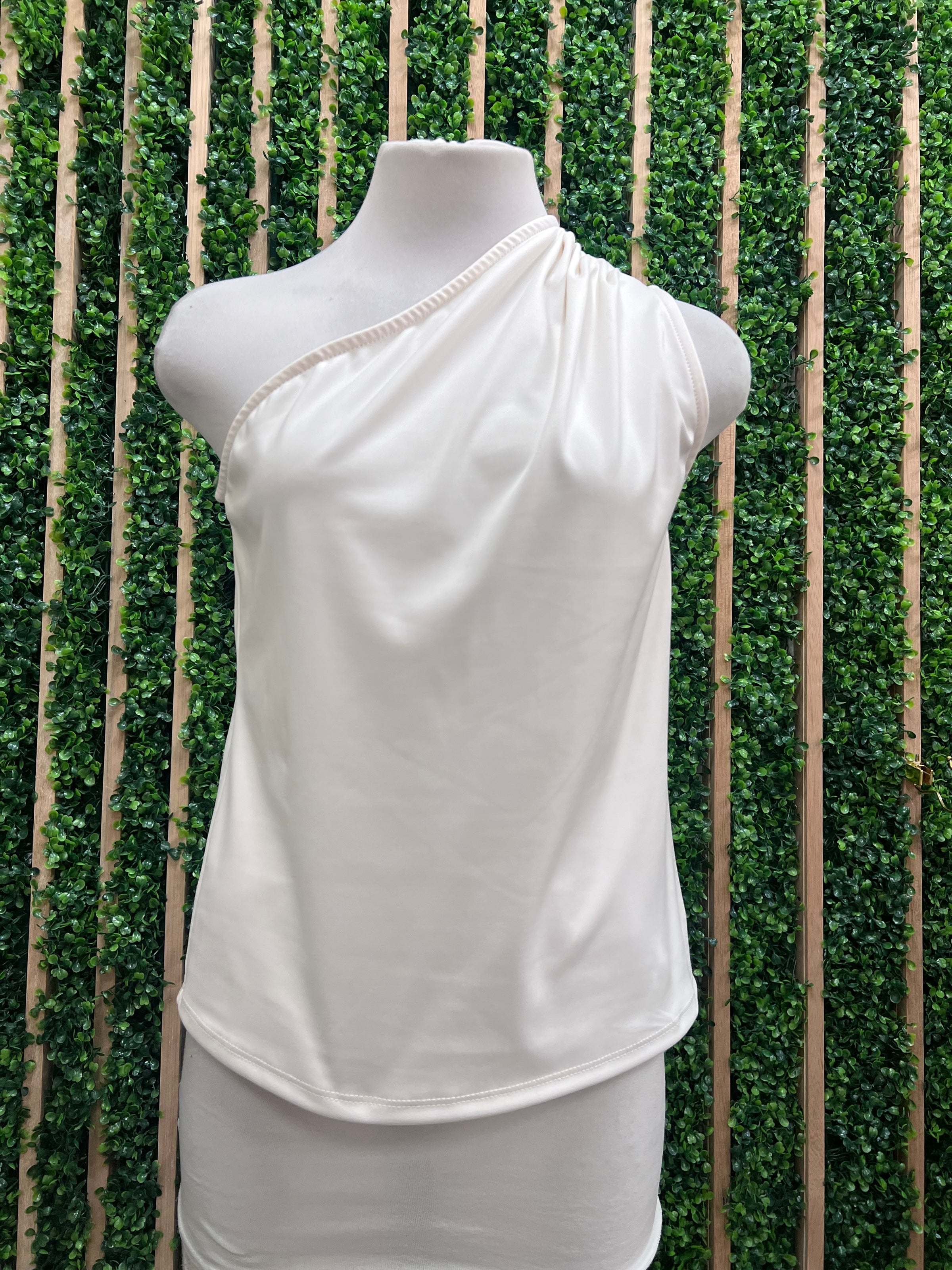 - Elevate your wardrobe with this striking metallic pleated one-shoulder top that commands attention.
