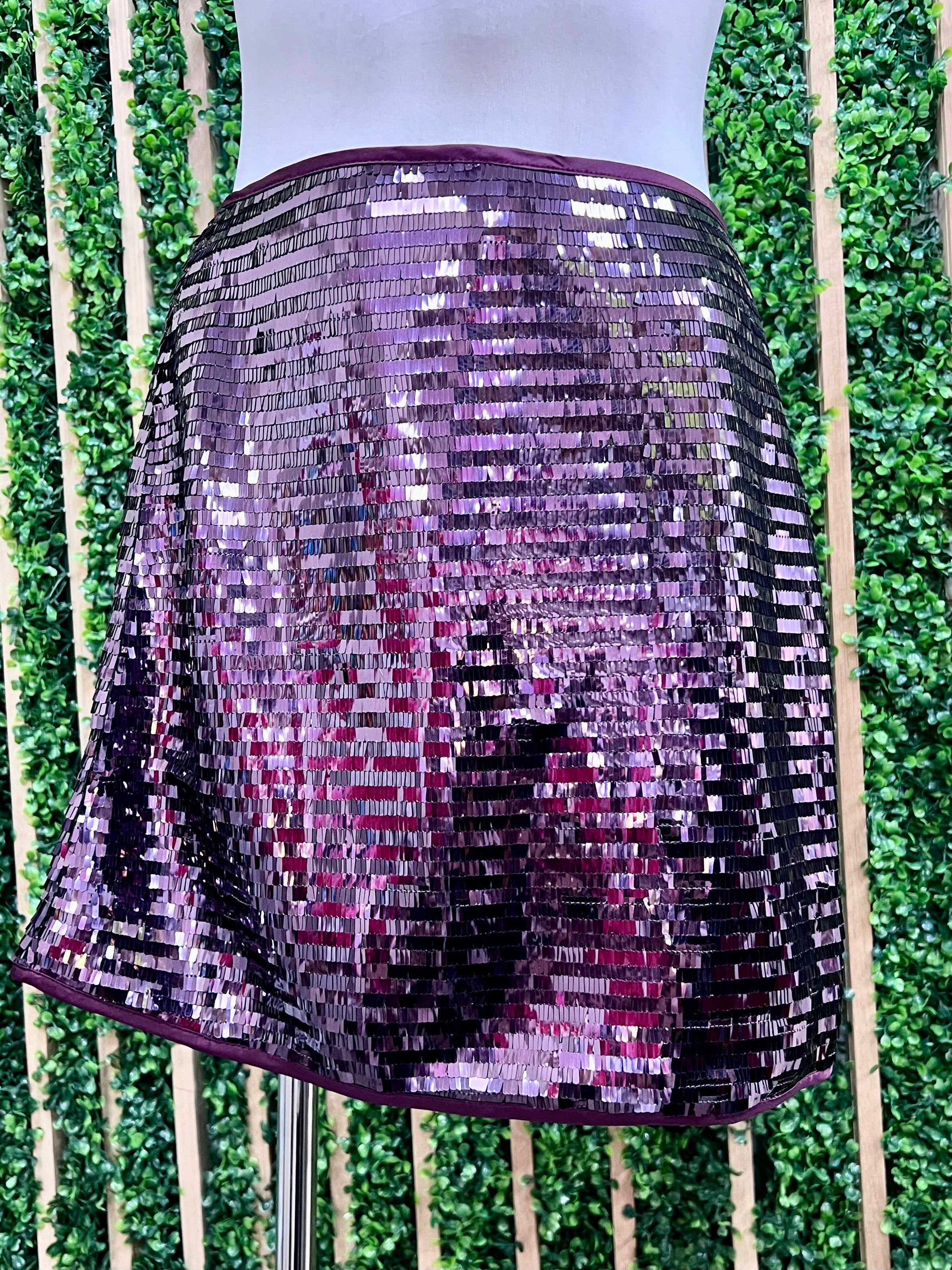 - Elevate your evening look with this stunning Short Eggplant Sequins Skirt.