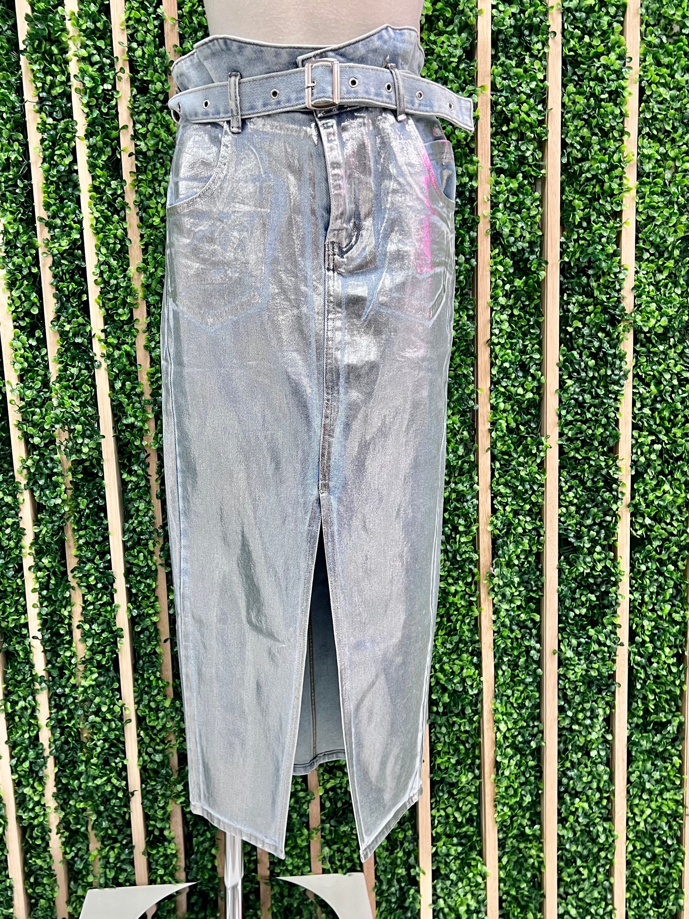 Silver Denim Front Slit Midi Denim Skirt