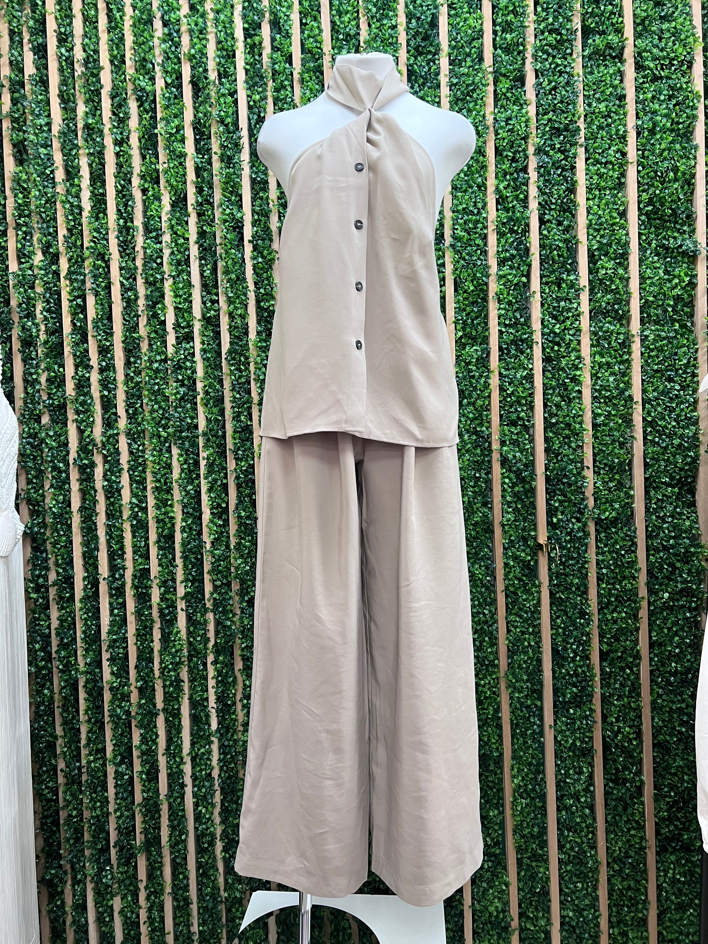 Minimal, modern, and effortlessly refined, the Button-Front Halter Top is a versatile wardrobe staple designed for elevated everyday styling. Featuring a soft neutral tone, this sleeveless halter top showcases a clean neckline with a subtle gathered detail and a full button-front closure that adds structure and polish.