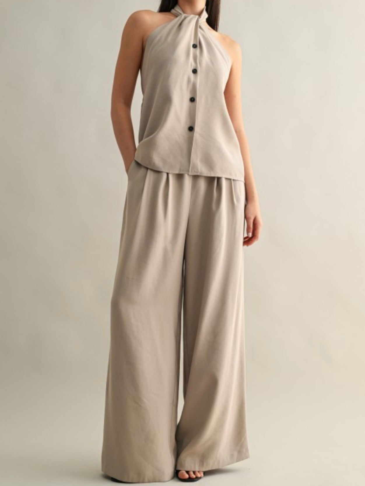 The wide-leg cut allows for breathability and ease, making them perfect for warm weather or all-day wear. A timeless piece that pairs beautifully with fitted tops, blouses, or the matching halter top (sold separately).