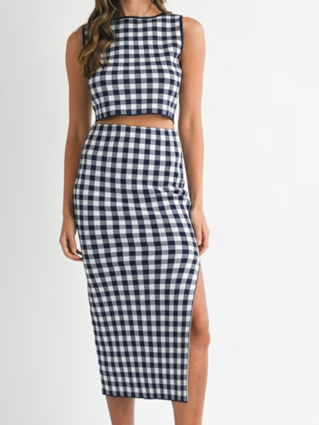 Elevate your style with this stunning navy gingham set featuring a sleeveless knit crop top paired with a matching midi skirt.