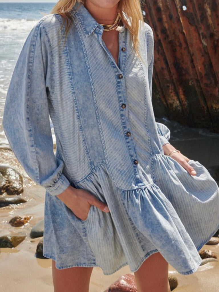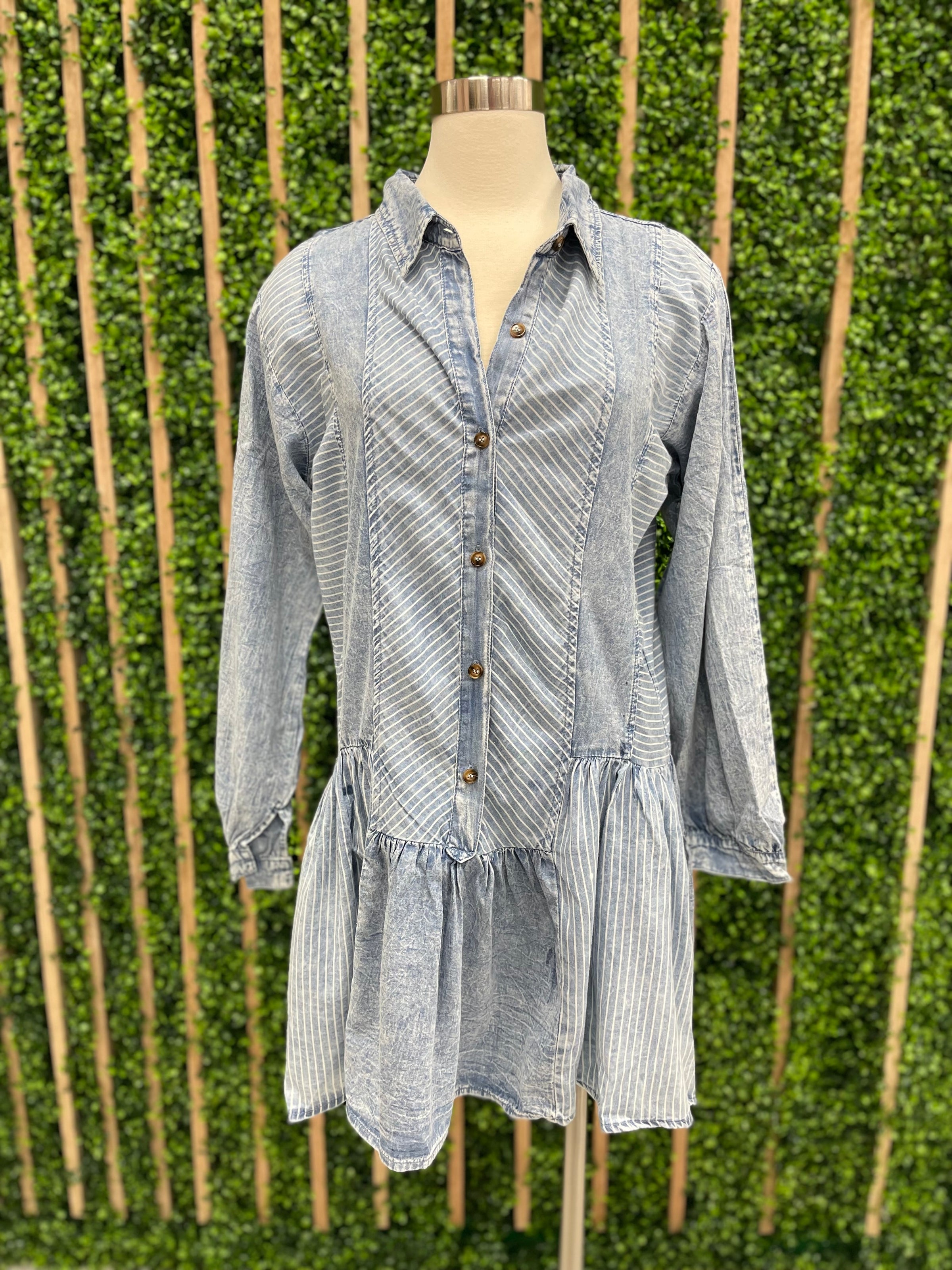 Blue Acid Wash Stripe Detail Drop Waist Dress