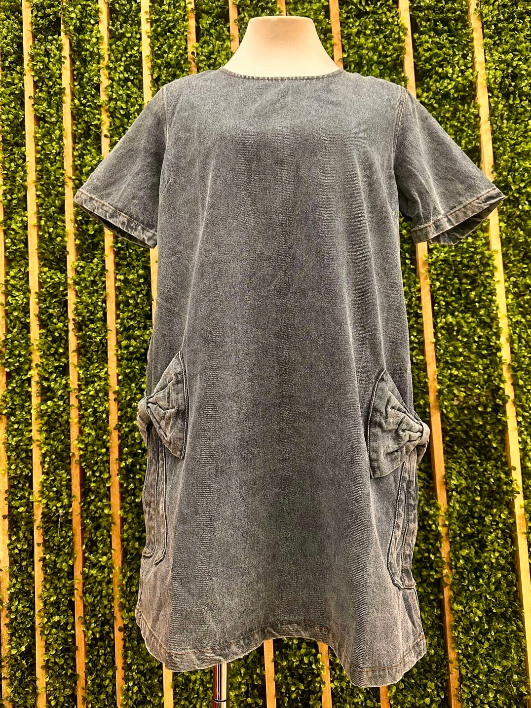 Bow Ribbon Detail Short Sleeve Short Denim Dress