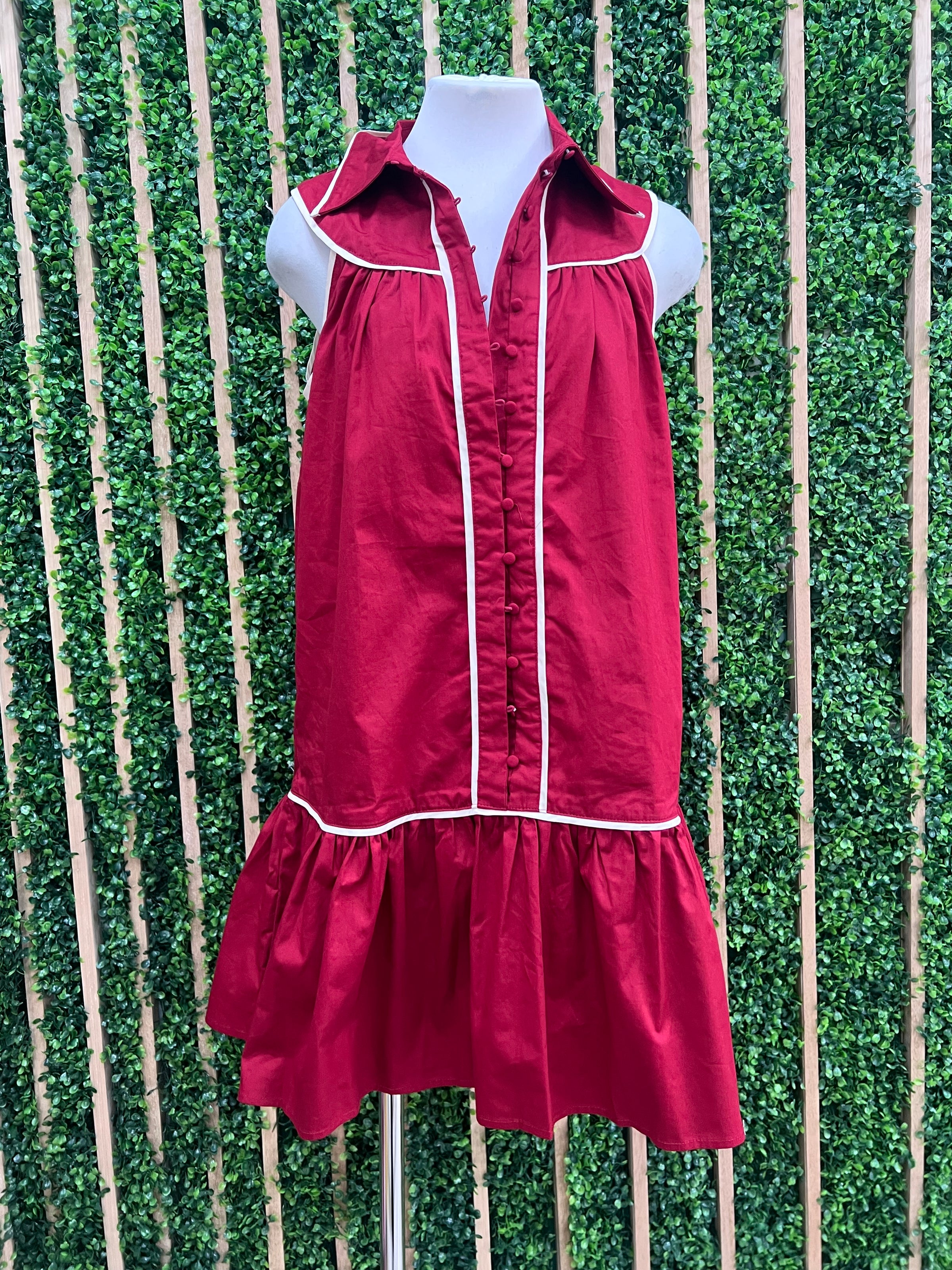 Crimson Sleeveless Collared Trimmed Drop Waist Short Dress