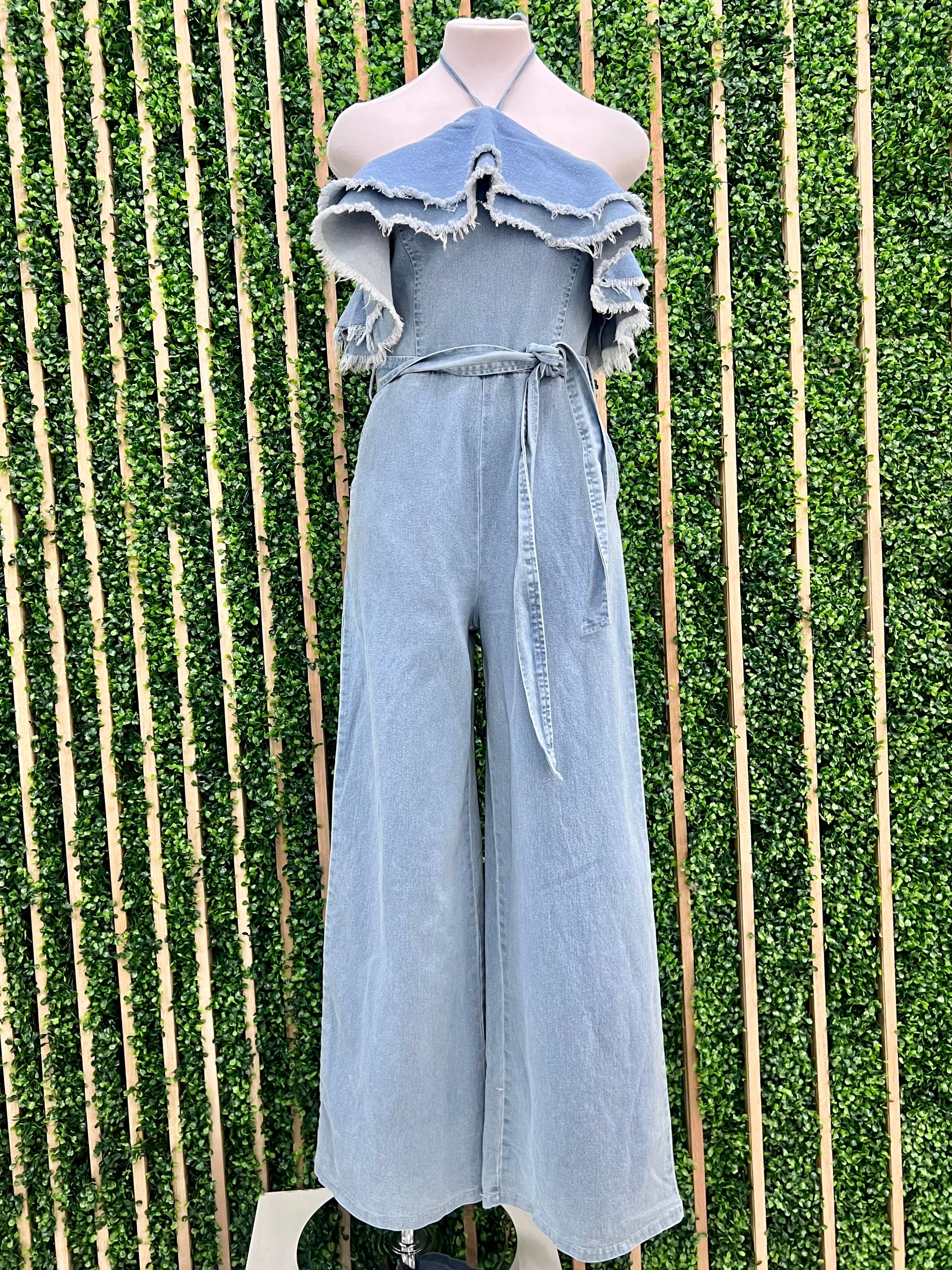 Halter Frayed Ruffle Denim Jumpsuit